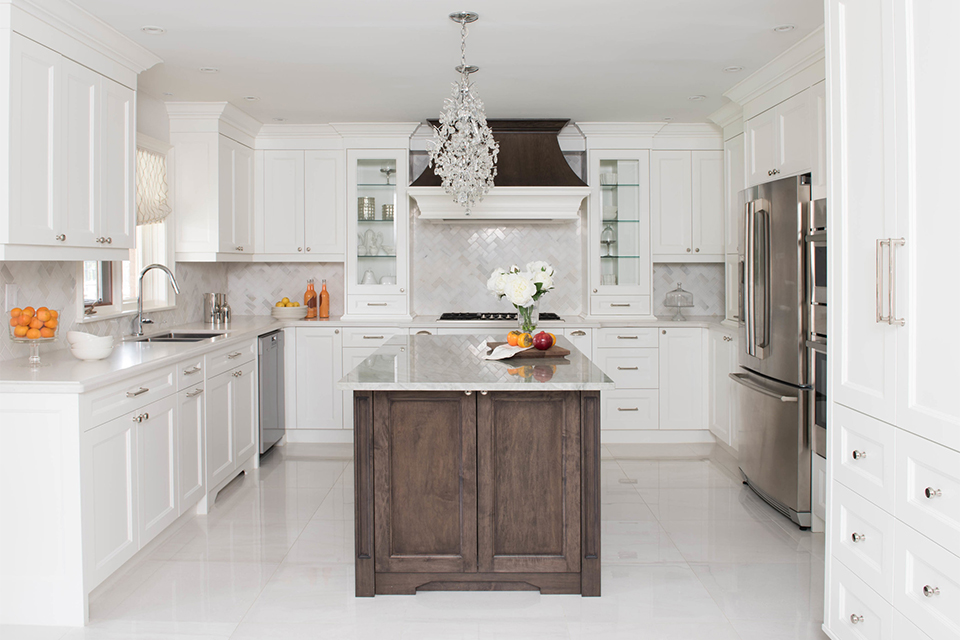 We choose a white kitchen because the home has a large covered deck which blocks a lot of the natural light. Keeping the kitchen white allows it to feel bright. The accent of the walnut brown tones contrasts against the white cabinetry and gives the space a stylish and tailored look.